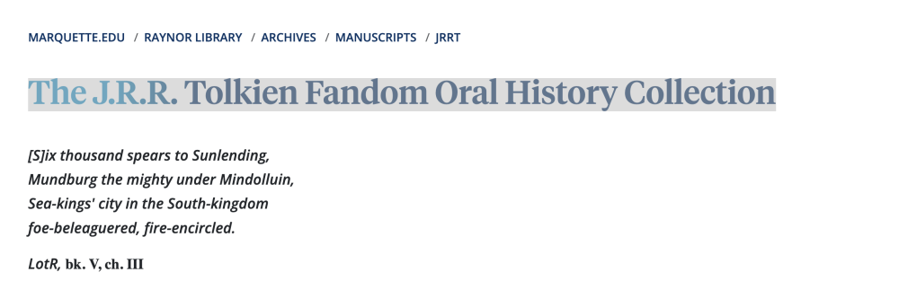 6.000 Speere zogen von Rohan aus, um Gondor zu helfen. 6.000 Interviews mit Tolkien-Fans möchte die Marquette University sammeln, um ihre Oral History Collection zu erweitern. Da nicht alle, die interessiert sind, die Möglichkeit haben, persönlich in Milwaukee aufs Band zu sprechen, kann man auch einen Online-Termin buchen und dann erzählen, wie man zu Tolkien gefunden hat und was einem ganz besonders zusagt. Voraussetzung ist allerdings, dass man Englisch spricht. Es ist nicht die erste derartige Kampagne, bereits existierende Interviews kann man sich auf der Marquette Homepage anhören.