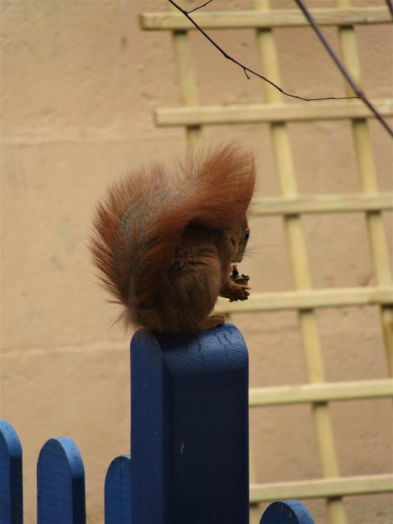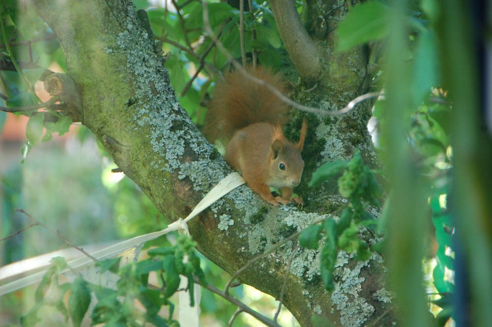 2. Jetzt habe ich doch mal ein Eichhorn-Bild gefunden. Qualität ist so mittel, weil durch's Fenster fotografiert. Mit dem Bändel neben dem Eichhörnchen hatte ich eine Wimpelkette am Baum festgebunden. Direkt vor oder nach dem Bild hat es dann versucht den Knoten durchzubeißen. Mir hatte schon mal ein Eichhörnchen eine Wimpelkette abgerupft. Keine Ahnung was die immer gegen meine Deko haben!