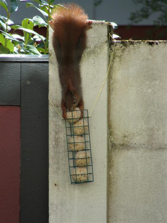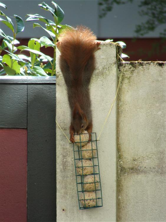 6. Dumm sind unsere kleinen Gartenbesucher mit Sicherheit nicht. Die Junghörnchen klopfen inzwischen an die Scheibe und drücken sich die Nase platt, wenn sie keine Walnüsse am gewohnten Platz vorfinden. Da kann es schon mal passieren, dass ein Junghörnchen Nase an Nase mit einer unserer Katzen vor der Terrassentür sitzt und nur die Glasscheibe die beiden trennt. Tara möchte sich dann immer mit dem Hörnchen unterhalten, aber das versteht keine kätzischen Äußerungen. Das freundliche Gurren scheint es aber richtig zu interpretieren, denn es zeigt keinerlei Angst. Vermutlich haben die Junghörnchen inzwischen gelernt, dass die drei Katzen ihnen nichts tun können. Eines der Junghörnchen tritt in die Fußstapfen von Gandalf, Gimli und Rosa. Es hängt wie sie als "Mini-Batman" am Meisenknödelhalter und mampft genüsslich vor sich hin. Die Junghörnchen der letzten drei Jahre haben das nicht gemacht. Wie man auf den Fotos gut erkennen kann, ist dieses Junghörnchen ein direkter Nachkomme unseres Gandalfs, der vielleicht auch eine Gandalfine gewesen sein könnte. Der Grauanteil im Fell ist bei diesem Hörnchen besonders hoch. Es hat zwei vollkommen rot befellte Geschwister und ein Geschwisterchen mit einem Hauch Grauanteil an den Flanken.