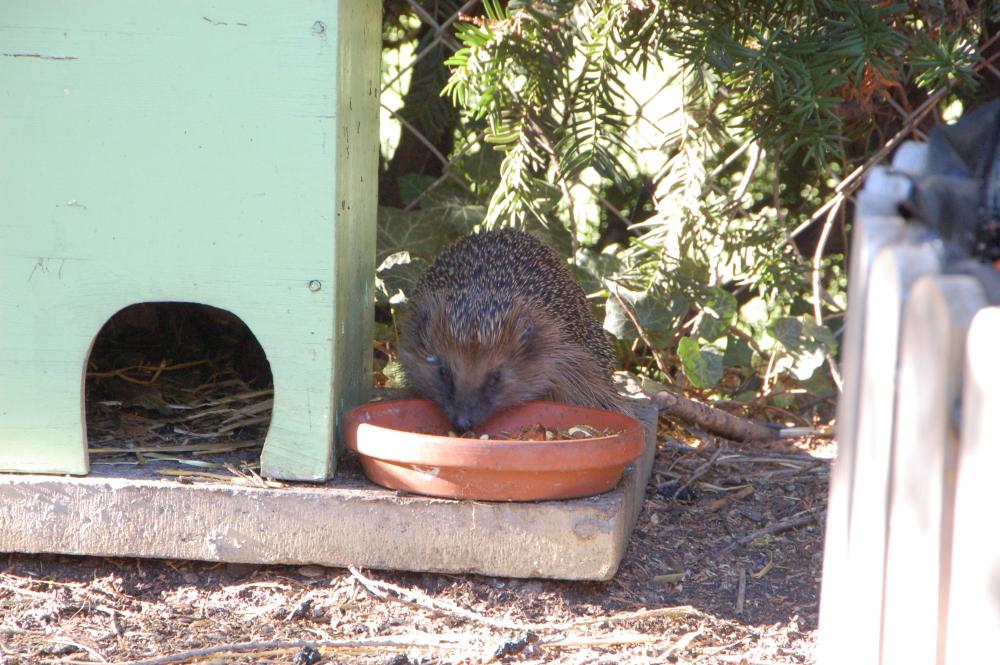 7. Ich habe etwas herausgefunden. Wenn ich nachmittags das Igelfutter auffülle, wartet er offensichtlich nur darauf dass ich endlich die Bahn frei mache um sich dann kopfüber in den Napf zu werfen. Ich war erst etwas besorgt - es kann ein Zeichen für Krankheit oder Unterernährung sein, wenn Igel tagsüber rauskommen. Deshalb habe ich ihn ein wenig beobachtet. Aber er bewegt sich normal und munter, ist nicht auffällig dünn und seine Stacheln glänzen in der Abendsonne. Scheint also nur verfressen zu sein.