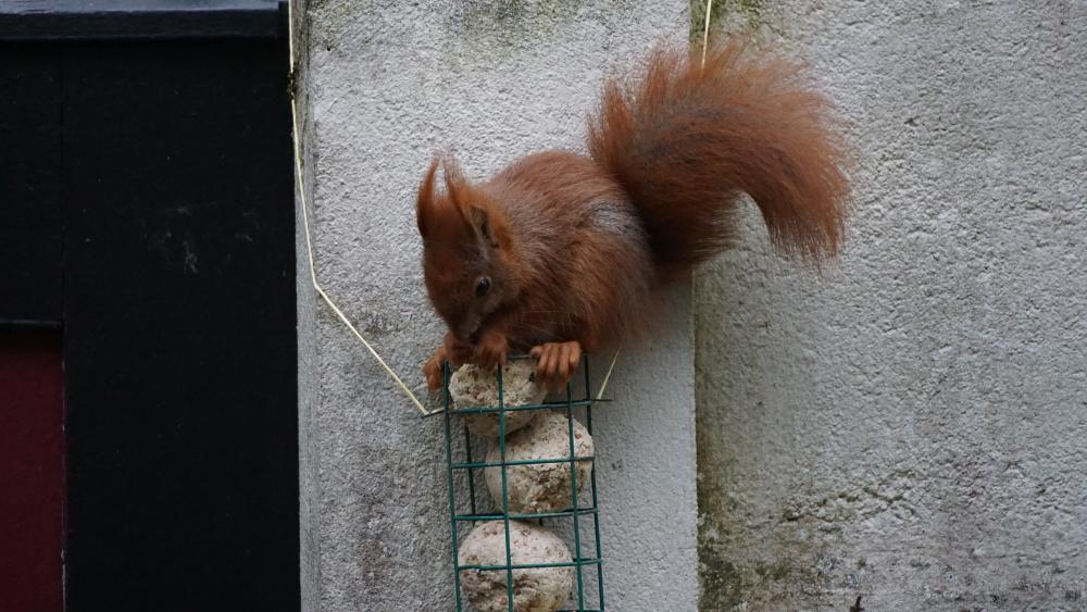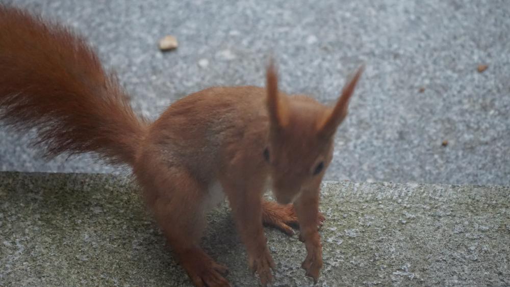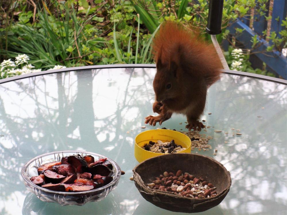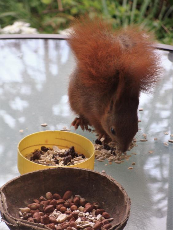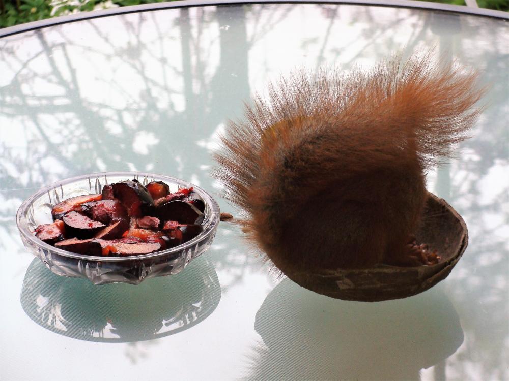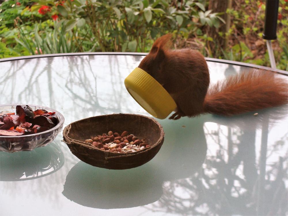 Dann gibt es bald kleine Igel ... Unsere Junghörnchen - zwei von ihnen - sind besonders gut erzogen worden. Sie fressen alle sehr gerne Obst, aber bitte nur das Fruchtfleisch. Während die anderen Eichhörnchen die Schale einfach da fallenlassen, wo sie gerade sitzen und fressen, legt das eine Junghörnchen die Schalen gut versteckt zwischen den Waldsteinien bzw. unseren Walderdbeeren ab. Das andere Junghörnchen legt die total abgenagten Schalen auf den Rand des Glastellers bzw. der Tupperdose. Da ist kein Fitzelchen Fruchtfleisch mehr dran. Inzwischen klopfen jetzt nicht nur die Eichhörnchen an die Scheibe, wenn das Frühstücksbüffet nicht pünktlich gereicht wird. Blau- und Kohlmeisen haben sich das abgeschaut und picken ebenfalls an die Scheibe. Die Amseln schieben den leeren Zitronenteedosendeckel ganz nach vorne an die Scheibe, damit ich auf den ersten Blick sehen kann, dass nichts mehr drin ist. Ich fürchte, dass ich inzwischen zum persönlichen Butler meiner Gartengäste erklärt wurde. Leider ist das Foto während des Anklopfens verwackelt.6 Punkte