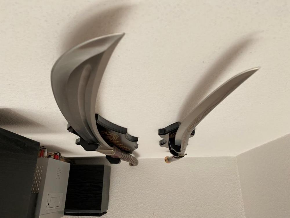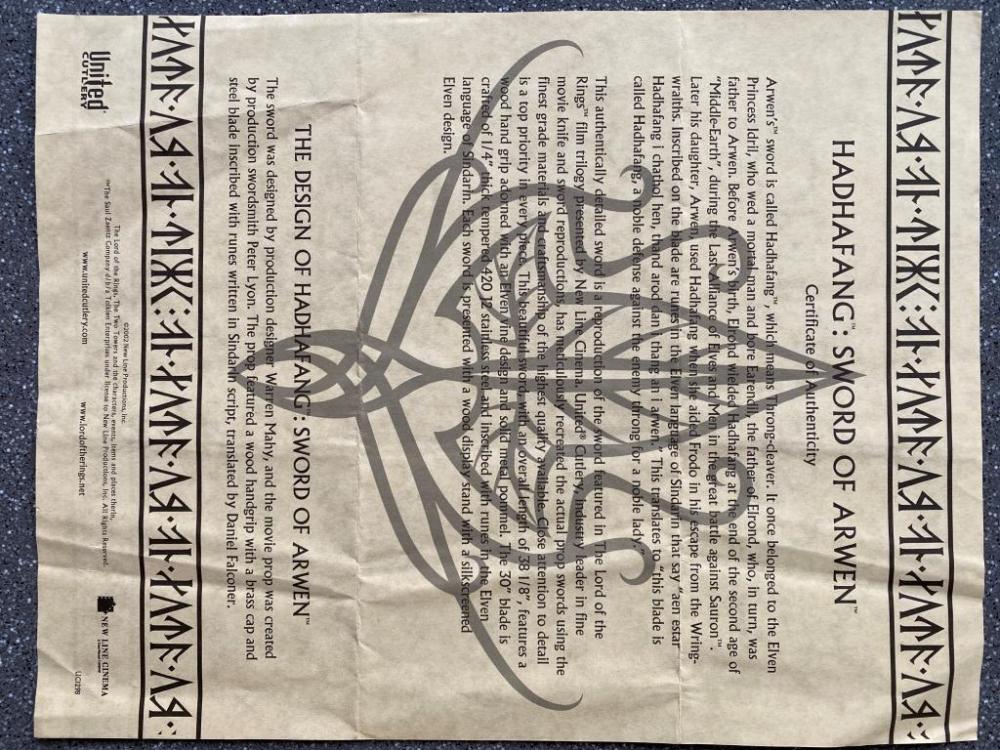 Die Schwerter sind wie neu. Sie hingen nur an der Wand. Allerdings habe ich den Schwertständer von Hadhafang in eine Wandhalterung umgebaut (siehe Bilder). Zertifikate und Verpackungen vorhanden. -